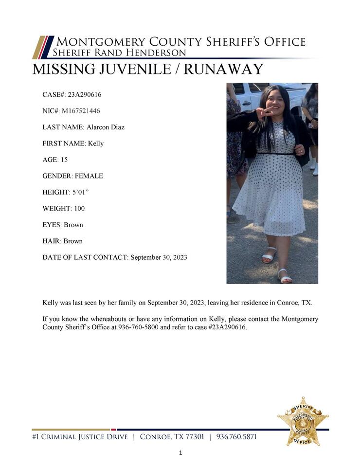 CONROE, TX – The Montgomery County Sheriff’s Office is searching for Kelly Alarcon Diaz, a missing juvenile. Kelly was last seen by her family on September 30, 2023, leaving her residence in Conroe, TX. If you know the whereabouts or have any information on Kelly, please contact the…