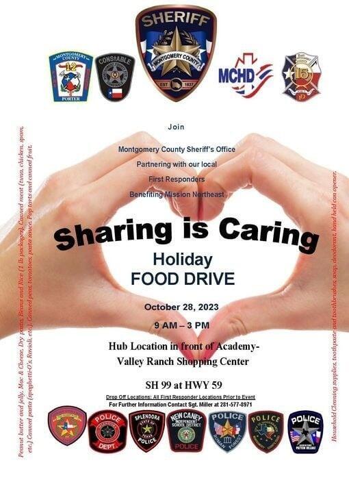 Montgomery County Sheriff’s Office Partners for the Sharing is Caring Food Drive. The Montgomery County Sheriff’s Office is partnering with our local First Responders for the Sharing is Caring Food Drive at the Academy Parking lot located at 21770 Market Place Drive, New Caney, Texas on October 28, 2023, from 9A-3P. If you are unable to attend, you can also drop off your items at any Montgomery County First Responder location prior to the event.