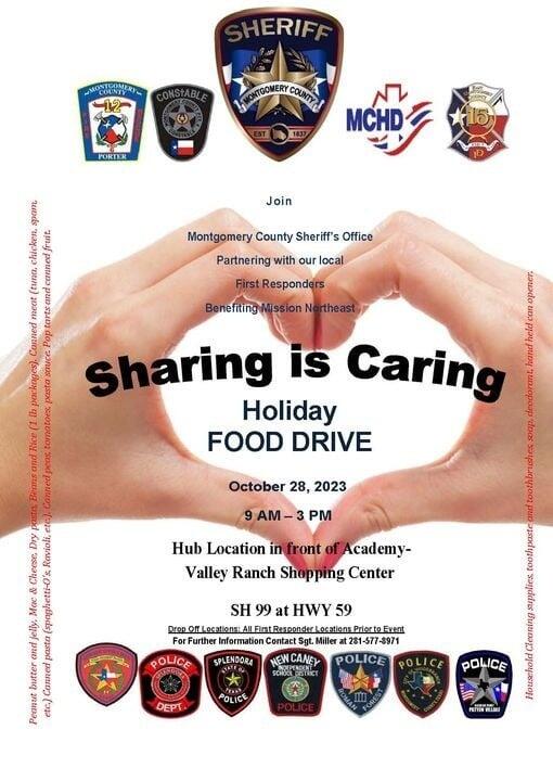 Montgomery County Sheriff’s Office Partners for the Sharing is Caring Food Drive. The Montgomery County Sheriff’s Office is partnering with our local First Responders for the Sharing is Caring Food Drive at the Academy Parking lot located at 21770 Market Place Drive, New Caney, Texas on October 28, 2023, from 9A-3P. If you are unable to attend, you can also drop off your items at any Montgomery County First Responder location prior to the event.