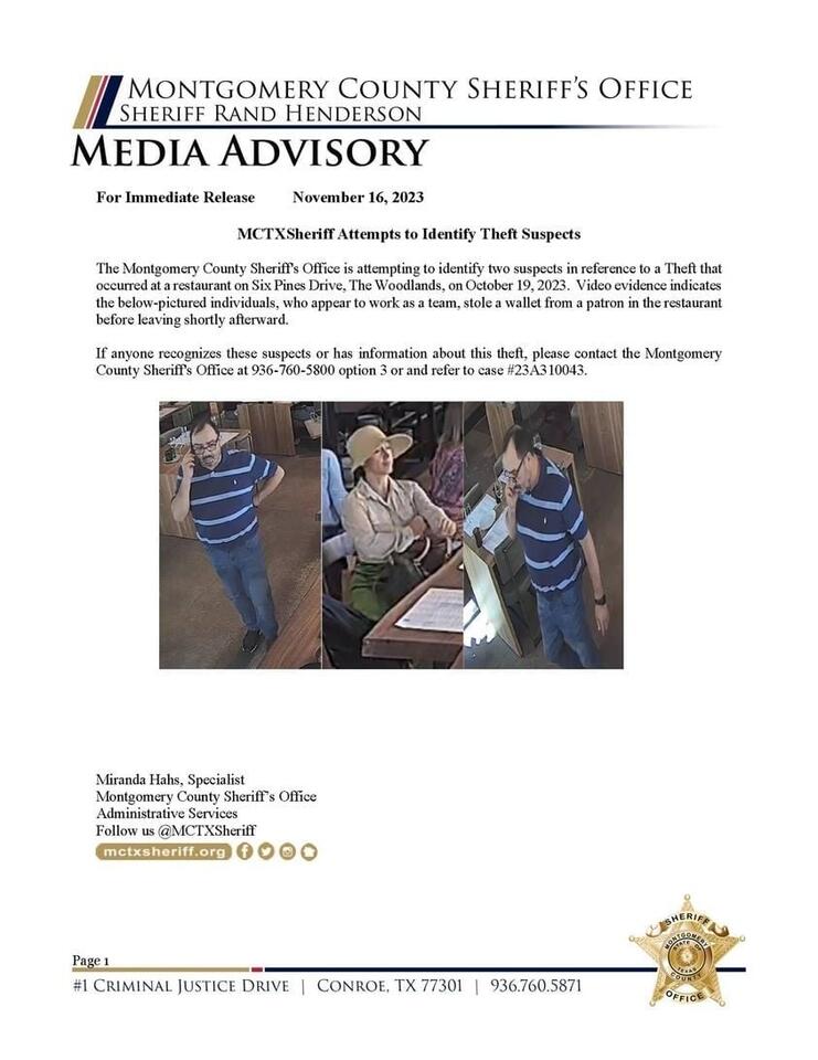 Montgomery County Sheriff’s Office Seeks Public Help in Theft. The Montgomery County Sheriff’s Office is attempting to identify two suspects in reference to a Theft that occurred at a restaurant on Six Pines Drive, The Woodlands, on October 19, 2023. Video evidence indicates the below-pictured individuals, who appear to work…