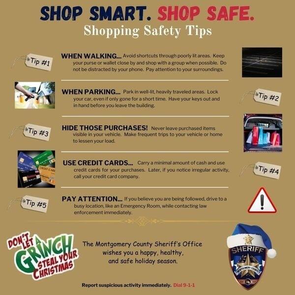 Stay Safe and Secure This Holiday Season with These Tips. The Montgomery County Sheriff’s Office wishes you a safe and happy holiday season. So, to assist you with that, here are some ways to keep safety at the top of your holiday shopping list. • Take a friend or…