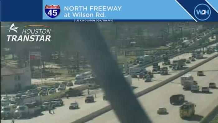 MONTGOMERY COUNTY, Texas – Four lanes of Interstate 45 in Montgomery County are closed on Monday due to a hazmat spill and crash. Two vehicles were involved in a crash on I-45 at Wilson Road. The right shoulder of the highway, the right lane, and two center lanes are closed due to the incident.