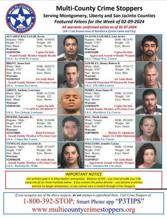 MONTGOMERY COUNTY, TX — Serving Montgomery, Liberty and San Jacinto Counties. Featured Felons for the Week of 02-09-2024. All warrants confirmed active as of 02-07-2024. Our primary goal is to keep tipsters anonymous. Because of this – you must provide your info using one of our three methods below. If you contact the police directly – you become a witness and are no longer anonymous, so you cannot earn a reward through Crime Stoppers.