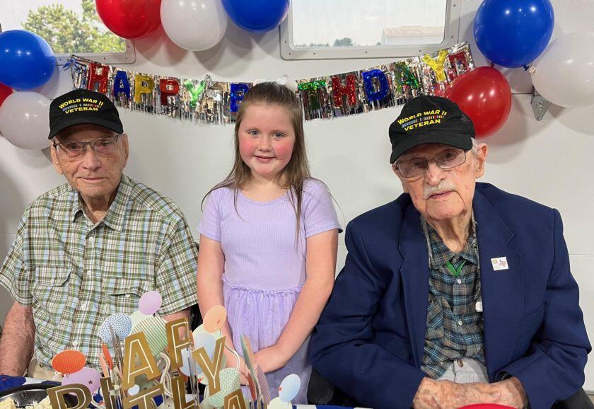 Emma Mansur, 6, stands between Veterans George Waters, 103, and Robert Putnam, 106, noting the difference of their ages with herself and the elder Vet as being 100 years. CONROE, TX — It was a day of celebration at The Lone Star Honor Flight Veterans Group, commonly known as 105, located at the Poplar Business Park off of Old Hwy 105 W in Conroe. June 12th is the birthday of both of the group’s centenarians, who turned another year older (think of the odds on that one). World War II Veterans Robert Putnam (106), and George Waters (103), were front and center, as the Veterans of 105, celebrated their birthdays. There was plenty of cake to go around and several Houston Texans cheerleaders were on hand to add some beauty to the proceedings.