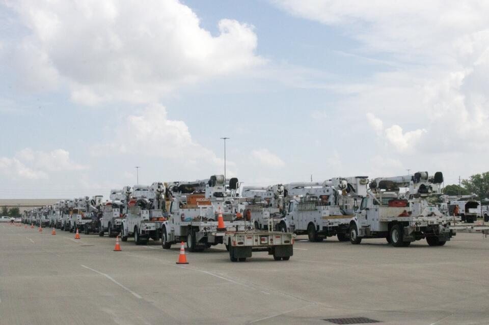 CenterPoint Energy lineman are staged in the Rhodes and Legacy football stadium parking lots at Katy ISD. (Aubrey Vogel/Community Impact) Following another round of heavy thunderstorms, which moved through the Houston area on July 12, power restoration efforts by CenterPoint Energy halted slightly as Entergy announced they had restored 75% of customers following Hurricane Beryl’s landfall on July 8.