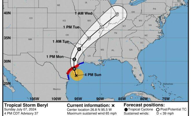 Original Article: https://hellowoodlands.com/july-7-5pm-update-tropical-storm-beryl-expected-to-intensify-landfall-early-monday/