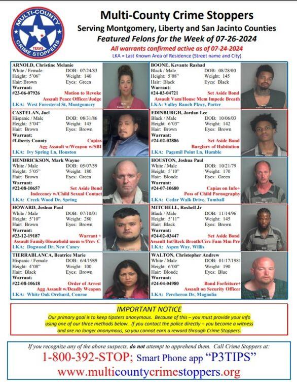 MONTGOMERY COUNTY, TX — Serving Montgomery, Liberty and San Jacinto Counties. Featured Felons for the Week of 07-26-2024. All warrants confirmed active as of 07-24-2024. Our primary goal is to keep tipsters anonymous. Because of this – you must provide your info using one of our three methods below. If you contact the police directly – you become a witness and are no longer anonymous, so you cannot earn a reward through Crime Stoppers.