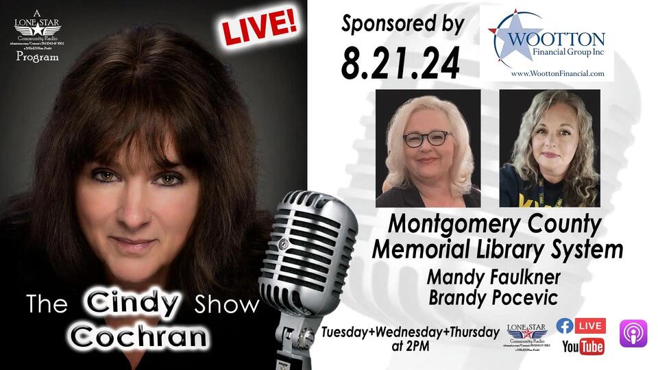 8.21.24 – Montgomery County Memorial Library System – The Cindy Cochran show on Lone Star Community Radio. Our Kids are back in School and The Montgomery Library is ready with programs to help enhance their learning journey This Summer it’s gonna be COOL to READ Literally!!! Listen in today and find out the Super Summer Programs from our beautiful Montgomery County Library ready for your kids and yourself!