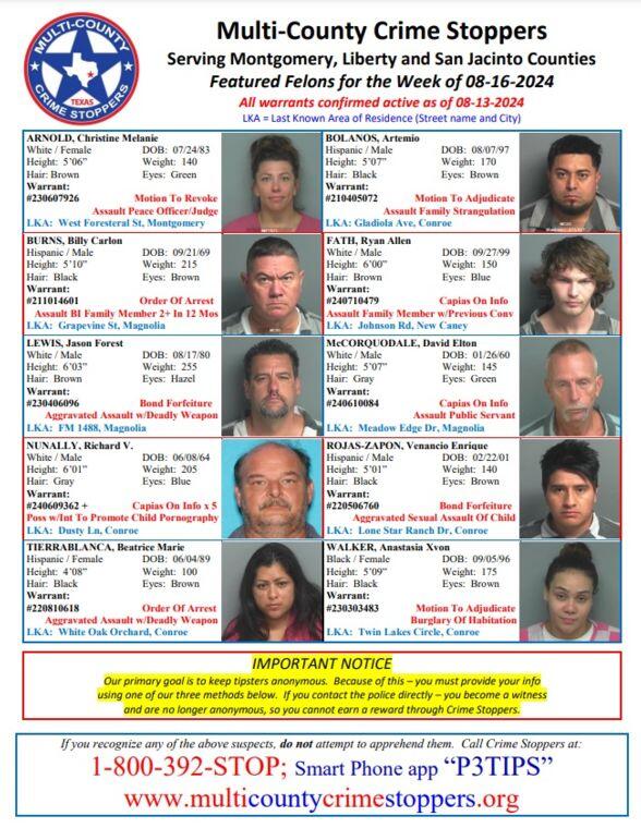 MONTGOMERY COUNTY, TX — Serving Montgomery, Liberty and San Jacinto Counties. Featured Felons for the Week of 08-16-2024. All warrants confirmed active as of 08-13-2024. Our primary goal is to keep tipsters anonymous. Because of this – you must provide your info using one of our three methods below. If you contact the police directly – you become a witness and are no longer anonymous, so you cannot earn a reward through Crime Stoppers.
