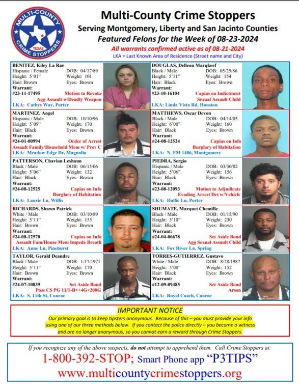 MONTGOMERY COUNTY, TX — Serving Montgomery, Liberty and San Jacinto Counties. Featured Felons for the Week of 08-23-2024. All warrants confirmed active as of 08-21-2024. Our primary goal is to keep tipsters anonymous. Because of this – you must provide your info using one of our three methods below. If you contact the police directly – you become a witness and are no longer anonymous, so you cannot earn a reward through Crime Stoppers.