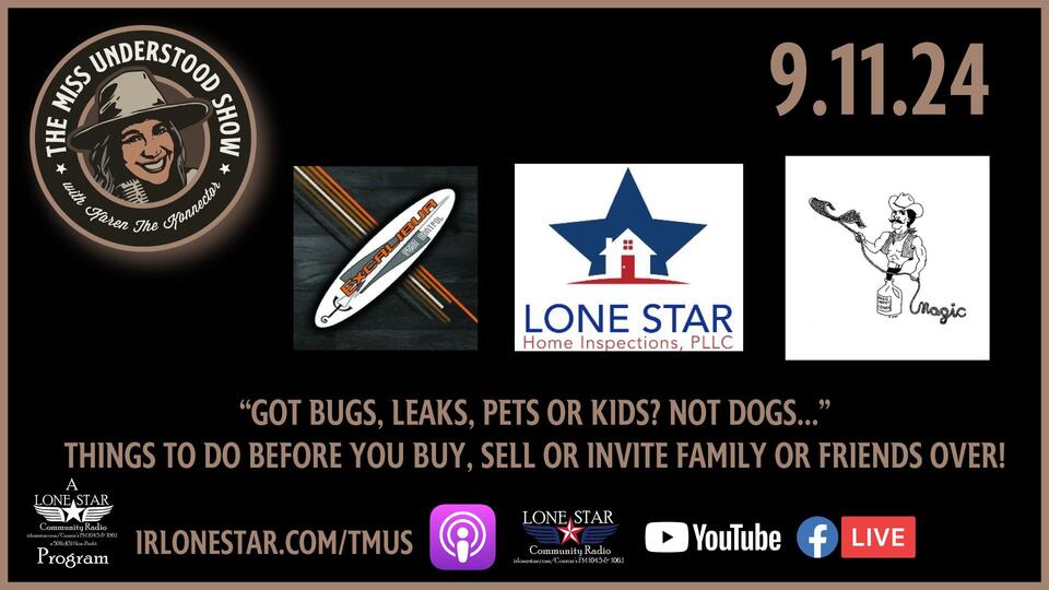 9.11.24 – “Got Bugs, Leaks, Pets or Kids? Not Dogs…” – The Miss Understood Show on Lone Star Community Radio. The Miss Understood Show is on every Wednesday at 1PM on https://irlonestar.com/. Donate to TMUS- https://irlonestar.kindful.com/?campaign=1313503. To be a guest and to sponsor the program…