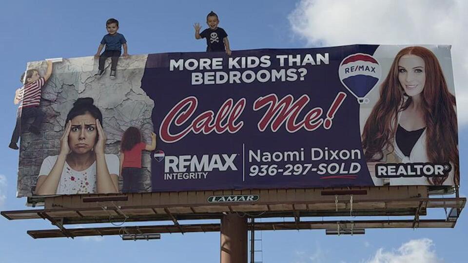 HOUSTON — A realtor in Conroe is getting a lot of calls thanks to what Mother Nature did to one of her billboard ads. The billboard is on Highway 105. The ad on it reads “More kids than bedrooms? Call me.” Naomi Dixon is the realtor behind the billboard.